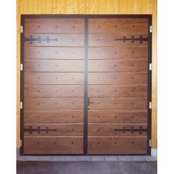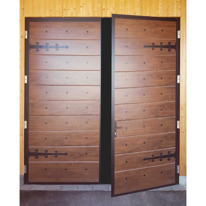 Garagen Flügeltür Mittelsicke in Glatt Scheunentür Holzoptik OldOak, Zierscharnier, Ziernieten ISO 40